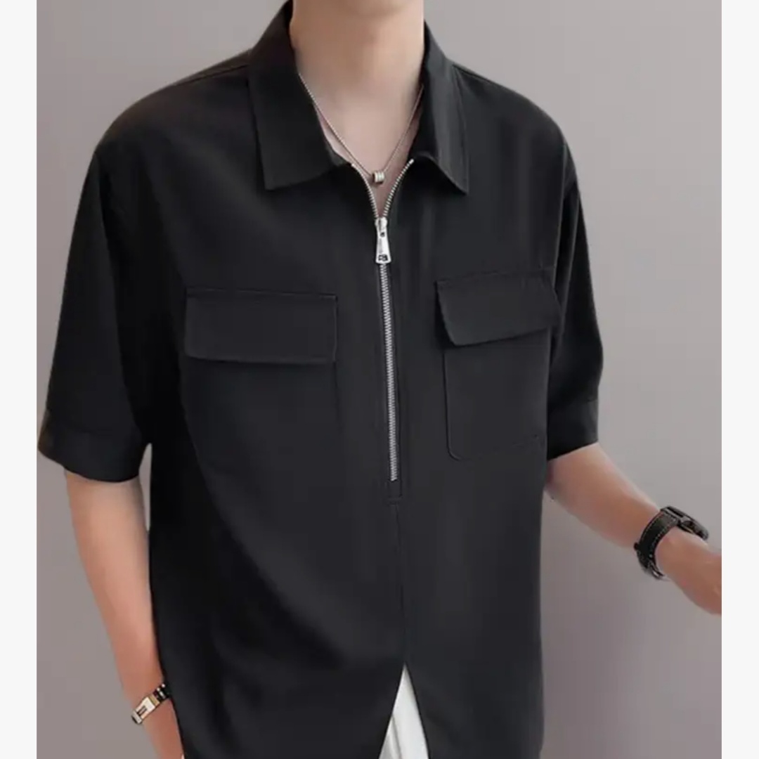 Dpiter Men's Black Ribbed Polo T-Shirt with Zipper - Stylish Casual Wear